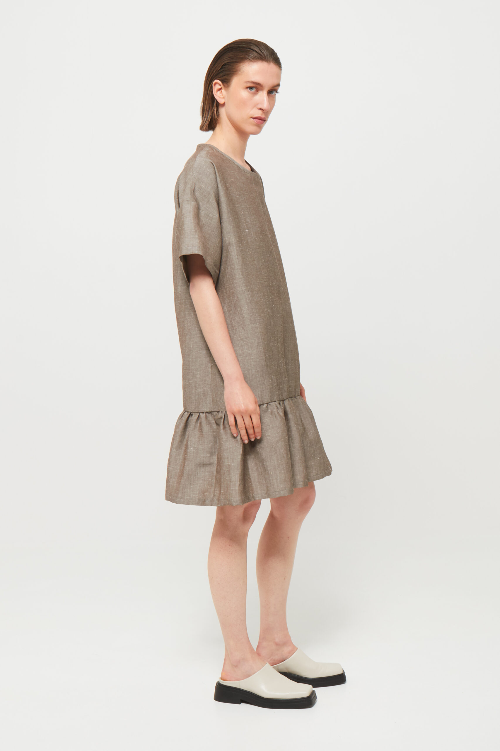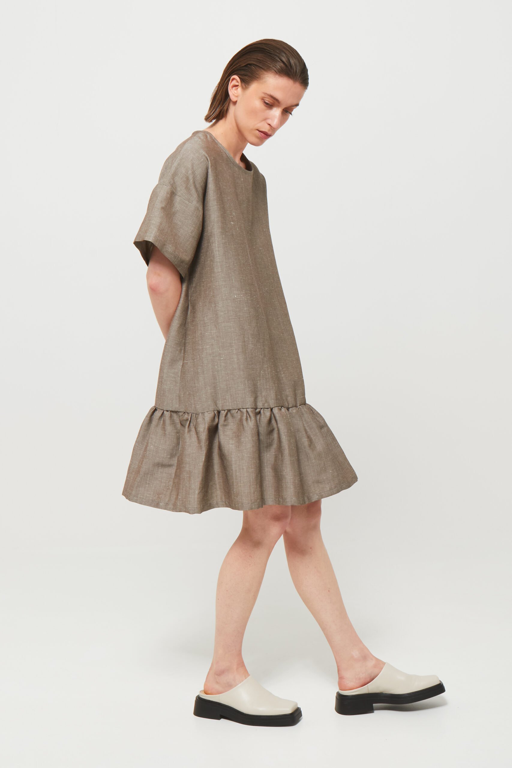 The HENK Dress Ruffle is inspired by the original HENK T-shirts — based on the oversized shirts my father used to wear, pieces that shaped my earliest sense of style. This dress translates that familiar T-shirt silhouette into a feminine and refined design.