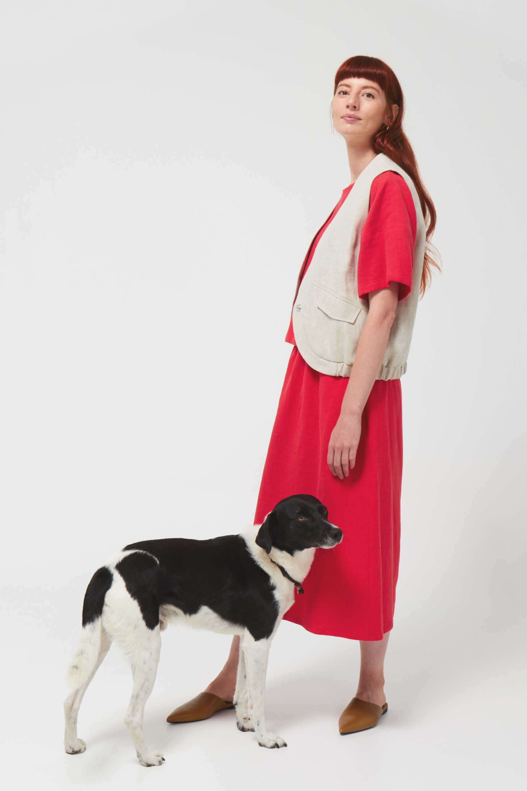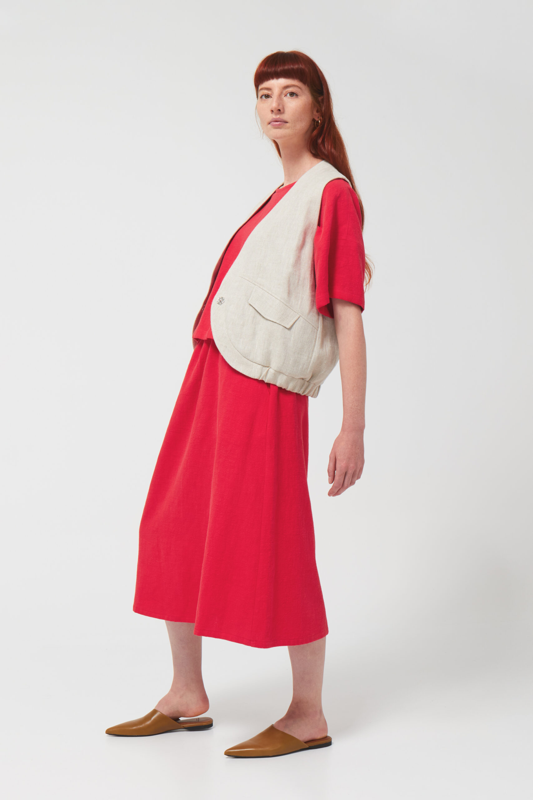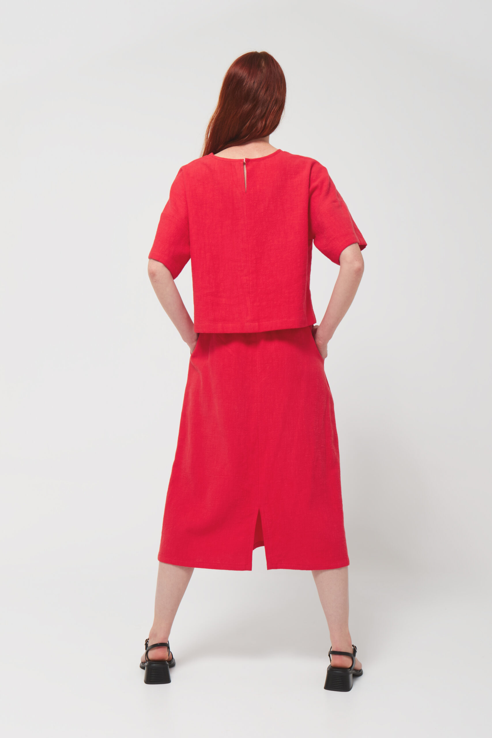 An elegant yet sporty skirt crafted from a premium ramie/cotton mix, offering the perfect blend of style and comfort. Designed with an elastic waistband for an effortless fit, this skirt is easy to wear all day long. It features convenient side pockets and a back slit.
